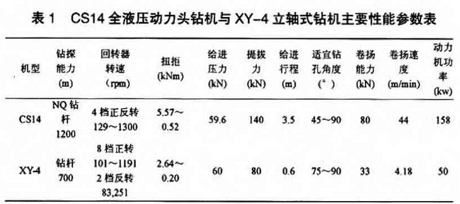 CS14全液壓鉆機(jī)和XY-4立軸式鉆機(jī)上要性能參數(shù)見(jiàn)表I。從鉆進(jìn)深度、扭拒、提拔力、給進(jìn)行程、鉆孔角度和卷?yè)P(yáng)能力等幾個(gè)方面來(lái)看,CS14型鉆機(jī)明顯優(yōu)于XY-4鉆機(jī).尤其是給進(jìn)行程長(zhǎng)和鉆孔角度范圍大,是XY-4型鉆機(jī)難以比擬的。