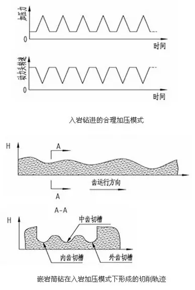 旋挖鉆機入巖作業(yè)是通過控制鉆壓來實現(xiàn)對巖石沖擊的。鉆壓在圖二所示的模式下連續(xù)循環(huán)浮動、增壓、減壓三個節(jié)拍。增壓時鉆頭轉(zhuǎn)動阻力增大而減速,減壓時鉆頭轉(zhuǎn)動阻力減小而加速,從動量、沖量轉(zhuǎn)化方程可知速度變化越大,變化時間越短對巖石的沖擊力越大。通過沖擊,有效解決了鉆機對巖石作用力不足,難以超越破碎巖石最低載荷值問題。通過對巖石的沖擊也有利于自由面的形成。鉆頭連續(xù)轉(zhuǎn)動中,刀頭間歇地沖擊巖石,結(jié)果在刀具運行方向上不斷形成凹凸不平,舊的凸起被破壞后又形成新的凸起。這些凹凸不平是鉆進的自由面,無論是大自由面還是小自由面都有利于巖石受載荷(特別是受沖擊載荷)后變形從整塊巖體上剝離形成巖屑,從而增加了鉆進效率。鉆機大的加壓能力和大的動力頭功率是實現(xiàn)入巖的設(shè)備條件,將設(shè)備能力轉(zhuǎn)化為有效破巖能力必須經(jīng)過脈沖加壓操作方式的合理配合。從圖二“入巖鉆進的合理加壓模式”看,旋挖鉆機入巖加壓模式為動、靜載聯(lián)合作用,靜載可以提高沖擊動載的作用力峰值。靜載還可以將鉆齒壓在孔底巖石上,使動載作用直接傳遞到巖石,減少功率傳遞損失和彈性碰撞的功率損失。動載有利于使對巖石的作用載荷超越一個門檻值。