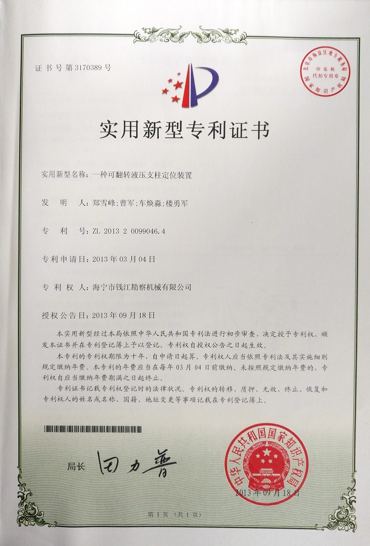 2013年3月6日,海寧市錢江勘察機械有限公司獲得由中華人民共和國國家知識產(chǎn)權(quán)局頒發(fā)的實用新型專利證書,實用新型名稱:一種可翻轉(zhuǎn)液壓支柱定位裝置,證書號:第3170389號